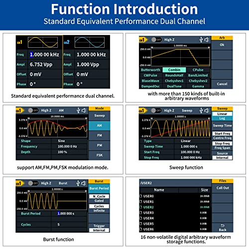 [Modulazione completa]: Tipi di modulazione facili da usare: AM, FM, PM, FSK, con sweep, funzione Burst, 16 tipi di funzione di archiviazione di forme d'onda arbitrarie digitali non volatili.