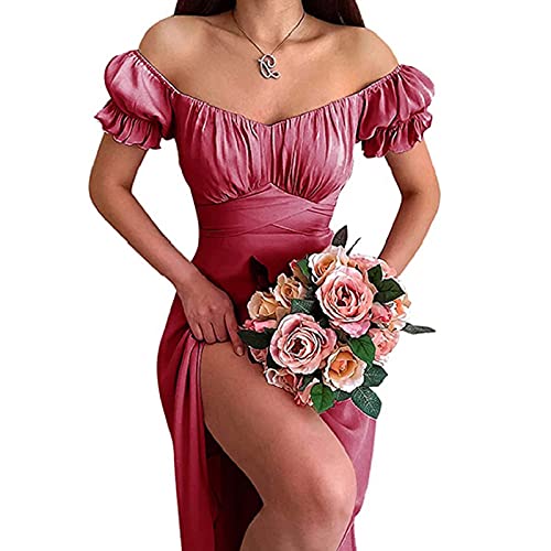 Oytto Abito lungo da donna Boho Off Spalla Maxi Abito Cottagecore Estetico Vintage Abito Lungo Casual Floreale Spiaggia Abiti Da Festa, Rosa scuro., XL