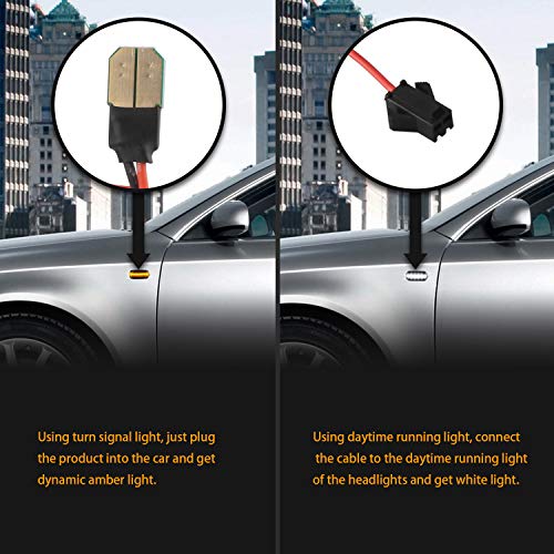 Ottiche ottiche, ogni indicatore luminoso del ripetitore laterale ha 18 chip LED SMD 2835 ad alta potenza per una maggiore luminosità con funzioni di commutazione a due colori. Cambia colore diverso tra DRL bianco (luce di marcia diurna) e indicatori laterali dinamici ambrati. Soddisfa le tue diverse esigenze.