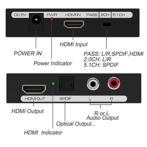 【Supporta più modalità】Il convertitore audio supporta tre modalità: l'ingresso HDMI viene convertito in uscita audio HDMI + (SPDIF + R / L), 2.1CH o 5.1CH o PASS, è possibile scegliere arbitrariamente la modalità desiderata.