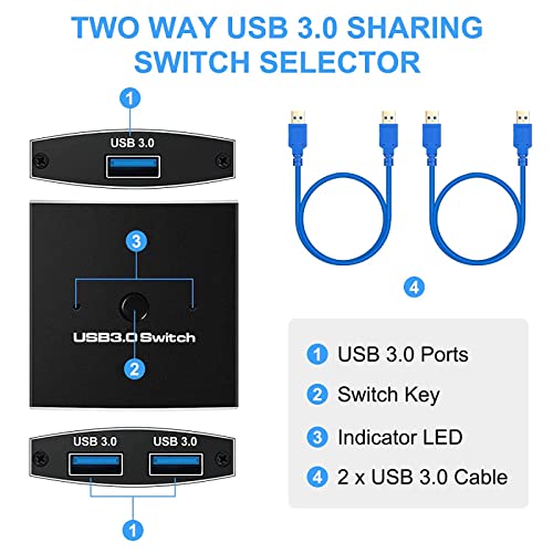 ⭐【Velocità di trasferimento dati 5 Gbps】⭐supporta il trasferimento dati USB 3.0 con velocità fino a 5 Gbps e compatibile con USB 2.0 e USB 1.1. Non raccomandato per commutare dispositivi di archiviazione di massa come hard disk, unità flash, schede di memoria, ecc. Si consiglia di collegare questo switch USB 2 PC al computer tramite il cavo USB in dotazione
