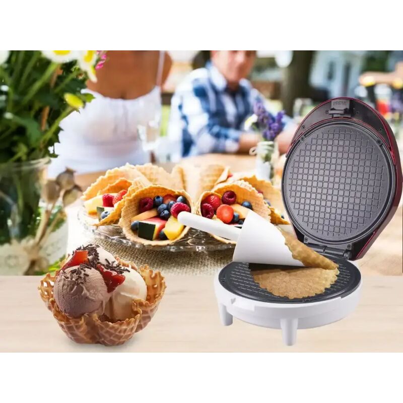 Piastra per cialde con piastra da 18cm in materiale antiaderente e impugnatura termoisolante. Indicata per la preparazione di croccanti coni o cestelli a coppetta per gelato, e rotoli di cialda. Ideale anche per cialde di formaggio. Dotata di luce di funzionamento e di raggiungimento della temperatura. Con stabili piedini antiscivolo e avvolgicavo. Accessorio per formare i coni in dotazione.