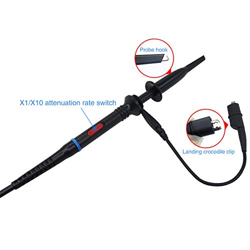【Durevoli e robusti】 Cavi di prova Realizzati con isolamento, i cavi di prova sono durevoli, flessibili e facili da maneggiare durante il test delle apparecchiature. Il set di sonde per oscilloscopio è dotato di regolatore capacitivo, utilizzando plastica super resistente e resistente all'usura importata dal giapponese, nessuna lamiera, bassa probabilità di danni alla capacità regolabile.