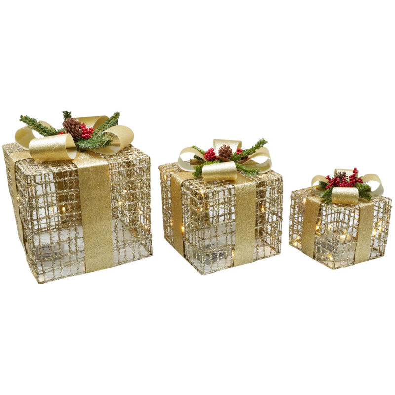 Pacchi di Natale Set 3 Pacchi di Natale con LED in Plastica Oro Set tre pacchi regalo con led per decorare e illuminare la tua stanza durante il periodo Natalizio. Caratteristiche Tecniche pacchi regalo in plastica di colore oro decorati da un moderno nastro con pigne e bacche rosse Funzionamento: 3 batterie di tipo AA da 1,5V (batterie non incluse) Dimensioni: 15 - 20 - 25 cm Età: 3+ (non adatto al gioco dei bimbi).