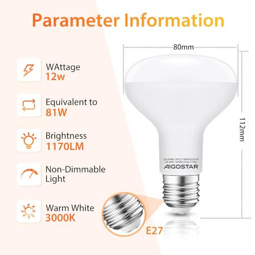 Pacco da 5 Lampadina LED E27 12W, Aigostar R80 Lampadine, Luce Calda 3000K 1170Lumen, Angolo a Fascio 170°, Non Dimmerabile