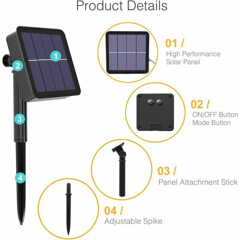 【Alta?efficienza】?Alimentato?da?energia?solare,?nessuna?batteria?necessaria.?L'orario di lavoro?può?fino a?10?ore?e?più?pieno?supporto, ?può?accendersi?automaticamente?di notte?e?spegnersi?di giorno. ???? 【Strisce luminose solari】?Una?lunghezza?di?12?metri?di?corde?solari,?progettate?con?100?LED?e?con?8?tipi?di?diversi ?modalità?di?illuminazione,?puoi?scegliere?la?modalità?che?ti?piace?(basta?premere?il?pulsante?sul?retro?del?pannello? ?solare? ?per?8?modalità) ???? 【Impermeabile】?Questa?catena luminosa?per?esterni?è?progettata?per?essere?IP?65?impermeabile.?Una?buona?resistenza?all?acqua?rende?queste?luci?solari ?perfetto?per?uso?interno?e?esterno.?Leggi di più ?bisogno?di?in?pioggia? ???? 【8?Modalità?&?Batteria?800mAh】Scegli?l?effetto?di?illuminazione?che?preferisci?e?crea?un?atmosfera?romantica.? Con?elevata?capacità?della?batteria? raggiungendo?800?mA,?questa?luce?solare?ha?bisogno?di?caricare?solo?6?a?8?ore?di?giorno?e?può?funzionare? ?da?8 ?mattina