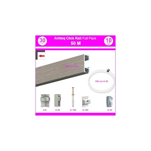 Altezza binario: 25 mm, profondità binario: 8,5 mm, lunghezza binario:, carico supportato: 30 kg per metro lineare, numero di binari:, fissaggi:, ganci:, 30 cavi perlon Slider 150 cm, terminali di finitura: 20 punte Click Rail Artiteq, angoli di finitura:, garanzia 10 anni