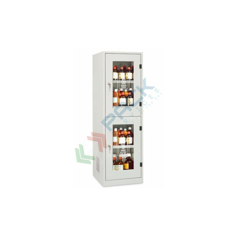 ARMADIO DI SICUREZZA PER PRODOTTI CHIMICI NON INFIAMMABILI - SERIE MULTIRISCHIO Armadio di sicurezza per lo stoccaggio di prodotti chimici non infiammabili, serie multirischio, Mis. 600 L x 600 P x 1950 H mm, 2 porte in vetro e 2 scomparti: scomparto ACIDI con 2 ripiani in acciaio verniciato, scomparto BASICI con 2 ripiani in acciaio inox. Capacità di 110 Lt (bottiglie da 1 litro per armadio), peso 70 Kg, capacità di carico 80 Kg. Armadio per prodotti chimici conforme alla norma EN 61010 e CEI 66-5. L'armadio di sicurezza permette la separazione per famiglie di prodotti. Soluzione modulare realizzata con struttura in lamiera metallica di 1,5 mm rivestita di polveri epossidiche antiacide con successivo passaggio termico di indurimento a 200 °C. Ripiani a vaschetta con angoli saldati a tenuta in acciaio. Porte con finestratura in policarbonato con chiusura a chiave. Spessore rivestimento superiore a 90 micron. Colore grigio RAL 7035. CARATTERISTICHE TECNICHE: Conformi alla NORMA EN