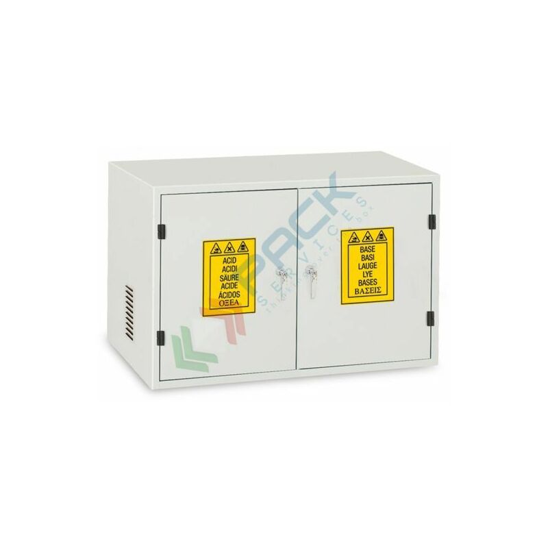 ARMADIO DI SICUREZZA PER PRODOTTI CHIMICI NON INFIAMMABILI - SERIE MULTIRISCHIO Armadio di sicurezza per lo stoccaggio di prodotti chimici non infiammabili, serie multirischio, Mis. 1140 L x 600 P x 700 H mm, 2 porte chieche e 1 scomparto singolo con 2 ripiani in acciaio verniciato. Capacità di 80 Lt (bottiglie da 1 litro per armadio), peso 50 Kg, capacità di carico 80 Kg. Armadio per prodotti chimici conforme alla norma EN 61010 e CEI 66-5. L'armadio di sicurezza permette la separazione per famiglie di prodotti. Soluzione modulare realizzata con struttura in lamiera metallica di 1,5 mm rivestita di polveri epossidiche antiacide con successivo passaggio termico di indurimento a 200 °C. Ripiani a vaschetta con angoli saldati a tenuta in acciaio. Porte con finestratura in policarbonato con chiusura a chiave. Spessore rivestimento superiore a 90 micron. Colore grigio RAL 7035. CARATTERISTICHE TECNICHE: Conformi alla NORMA EN 61010 e CEI 66-5. Cartelli conformi alle norme ISO 3864.