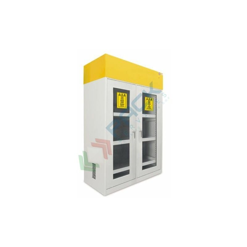ARMADIO DI SICUREZZA PER LO STOCCAGGIO DI PRODOTTI CHIMICI - ASPIRATORE E FILTRO INCLUSO Armadio di sicurezza per lo stoccaggio di prodotti chimici, aspiratore e filtro incluso, Mis. esterne 1140 L x 600 P x 1900 H mm, Mis. interne 1080 P x 550 L x 1500 H mm, 3 ripiani a vaschetta in acciaio con spessore 10/10 mm, dimensione ripiano 1030 L x 550 P x 30 H mm, doppia anta battente in vetro, serratura a cilindro con chiave, peso 125 Kg. Armadio per chimici realizzato in lamiera di acciaio elettrozincata (Skin passat) FE P01 spessore 10/10 mm pressopiegata a freddo e verniciata, previo trattamento di sgrassaggio, con una prima applicazione di fondo epossidico e con 2 successive applicazioni di polveri termoindurenti e successivo passaggio in galleria termica a 200 °C. Filtro carbone attivo montato in alto, adatto per sostanze acide, con prefiltro. Facile sostituzione del filtro dietro un pannello incernierato con serratura a chiave. Armadio per lo stoccaggio di prodotti chimici
