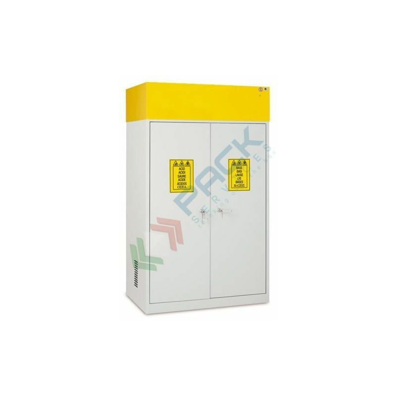 ARMADIO DI SICUREZZA PER LO STOCCAGGIO DI PRODOTTI CHIMICI - ASPIRATORE E FILTRO INCLUSO Armadio di sicurezza per lo stoccaggio di prodotti chimici, aspiratore e filtro incluso, Mis. esterne 1140 L x 600 P x 1900 H mm, Mis. interne 1080 P x 550 L x 1500 H mm, 3 ripiani a vaschetta in acciaio con spessore 10/10 mm, dimensione ripiano 1030 L x 550 P x 30 H mm, doppia anta cieca a battente, serratura a cilindro con chiave, peso 125 Kg. Armadio per chimici realizzato in lamiera di acciaio elettrozincata (Skin passat) FE P01 spessore 10/10 mm pressopiegata a freddo e verniciata, previo trattamento di sgrassaggio, con una prima applicazione di fondo epossidico e con 2 successive applicazioni di polveri termoindurenti e successivo passaggio in galleria termica a 200 °C. Filtro carbone attivo montato in alto, adatto per sostanze acide, con prefiltro. Facile sostituzione del filtro dietro un pannello incernierato con serratura a chiave. Armadio per lo stoccaggio di prodotti chimici rispondente