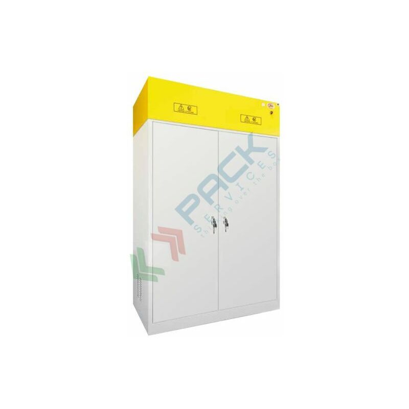ARMADIO PER LO STOCCAGGIO DI PRODOTTI CITO TOSSICI CHEMIOTERAPICI Armadio di sicurezza per lo stoccaggio di prodotti cito tossici chemioterapici, 2 porte cieche, Mis. esterne 1140 L x 600 P x 1900 H mm (1600 + 300), Mis. interne 1080 L x 550 P x 1500 H mm, 3 ripiani in acciaio Inox, Mis. 1030 L x 550 P x 30 H mm, peso 130 Kg. Filtro carbone, filtro HEPA ed aspiratore inclusi. Armadio di sicurezza conforme alla norma EN 61010-1 e CEI 66-5, conforme ai DPR 303/56, DPR 577/82, marchio CE. Armadio per lo stoccaggio costruiti completamente in lamiera di acciaio elettrozincata (Skin passat) FE P01 spessore 10/10 mm pressopiegata a freddo e verniciata, previo trattamento di sgrassaggio, con una prima applicazione di fondo epossidico e con 2 successive applicazioni di polveri termoindurenti e successivo passaggio in galleria termica a 200° C. Costruzione di tipo monolitico con alla base piedini per la messa a livello dellarmadio. Porte tamburate e reversibili complete di maniglie con chiusura