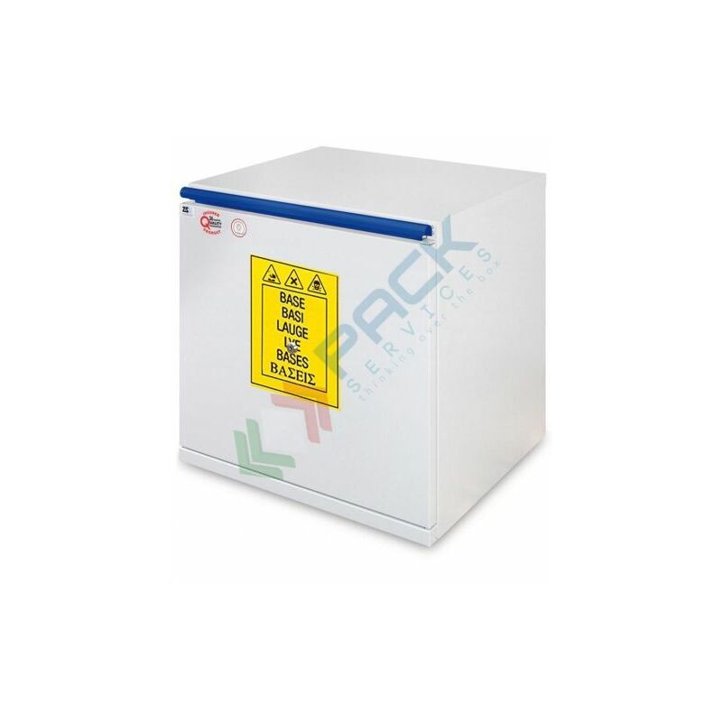 ARMADIO DI SICUREZZA PER LO STOCCAGGIO COMBINATO DI PRODOTTI CHIMICI E BASICI Armadio di sicurezza per lo stoccaggio combinato di prodotti chimici e basici, Mis. esterne 595 L x 520 P x 620 H mm, Mis. interne 530 L x 430 P x 530 H mm, capacità 15 bottiglie da 1 Lt, peso 55 Kg. Serratura con chiave e blocco delle porte, morsetto di terra per prevenire cariche elettrostatiche. Armadio per chimici realizzato in lamiera di acciaio con vernice antiacido. Le finiture interne sono realizzate in laminato melaminico con alta resistenza ai vapori aggressivi. Pannelli agglomerato idrofugo. Spessore della lamiera 1;