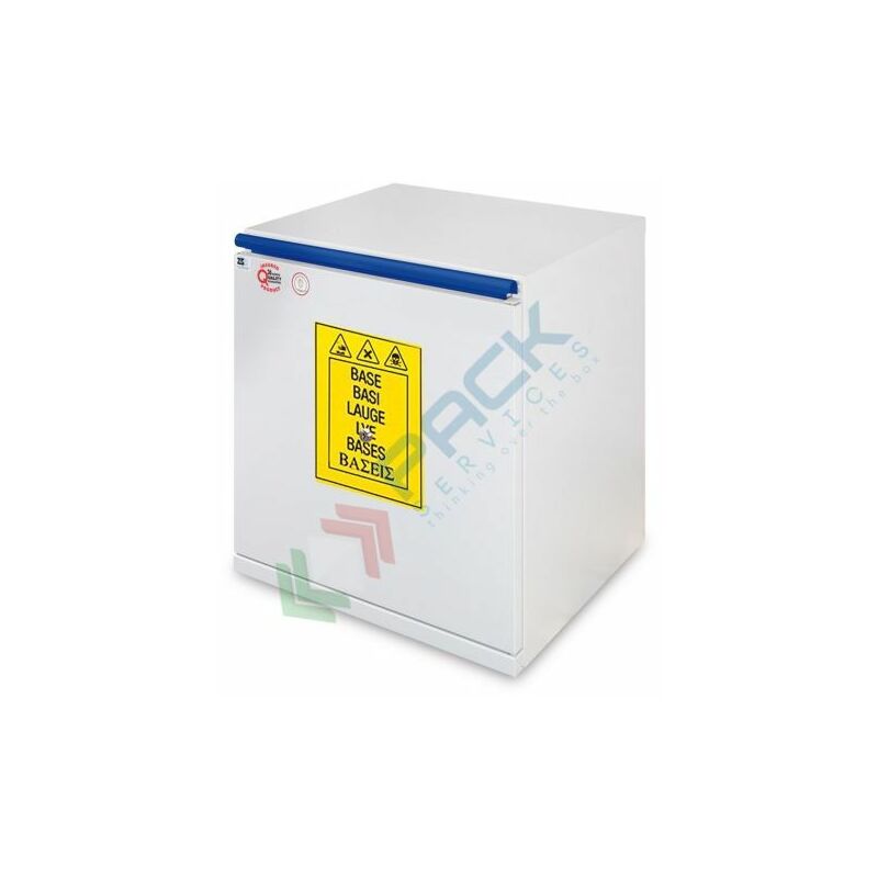 ARMADIO DI SICUREZZA PER LO STOCCAGGIO COMBINATO DI PRODOTTI CHIMICI E BASICI Armadio di sicurezza per lo stoccaggio combinato di prodotti chimici e basici, Mis. esterne 495 L x 520 P x 620 H mm, Mis. interne 430 L x 430 P x 530 H mm, capacità 12 bottiglie da 1 Lt, peso 53 Kg. Serratura con chiave e blocco delle porte, morsetto di terra per prevenire cariche elettrostatiche. Armadio per chimici realizzato in lamiera di acciaio con vernice antiacido. Le finiture interne sono realizzate in laminato melaminico con alta resistenza ai vapori aggressivi. Pannelli agglomerato idrofugo. Spessore della lamiera 1;
