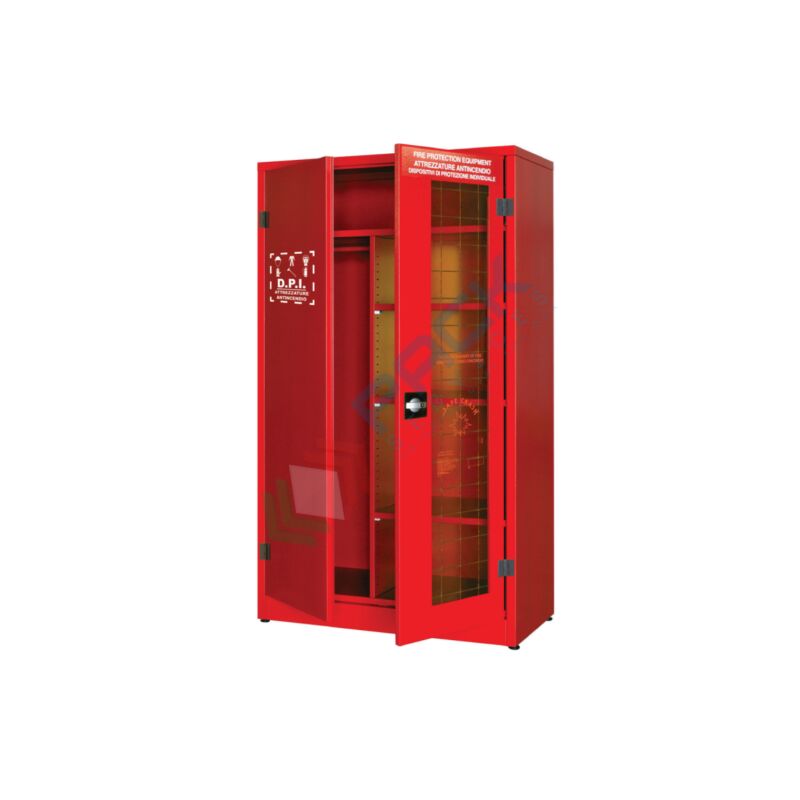 Armadio porta DPI componibile ideale per contenimento dispositivi di protezione individuale, Mis. 1075 L x 500 P x 1850 H mm, in lamiera di acciaio al carbonio P02 spessore 10/10, pre-trattato con fosfosgrassaggio in tunnel alte temperature, verniciatura in epossipoliestere colore rosso RAL 3000 e cottura in galleria termica 180°. Armadio contenitore DPI in metallo, con 3 ripiani regolabili in altezza (portata 50 Kg), spigolo arrotondato, robuste cerniere in zama spessore 6 mm, piedini regolabili, serratura ergonomica in plastica e alluminio con doppia chiave completa di chiusura ad asta con carter copriaste antimanomissione. Armadio porta DPI in metallo con 2 ante di cui una con vetro frangibile, appendiabiti parziale e cappelliera. Armadio per contenimento dispositivi di protezione individuale costruito a regola darte in risposta alle normative vigenti. Armadio di sicurezza per DPI con etichettatura di sicurezza come disposizioni della normativa vigente.