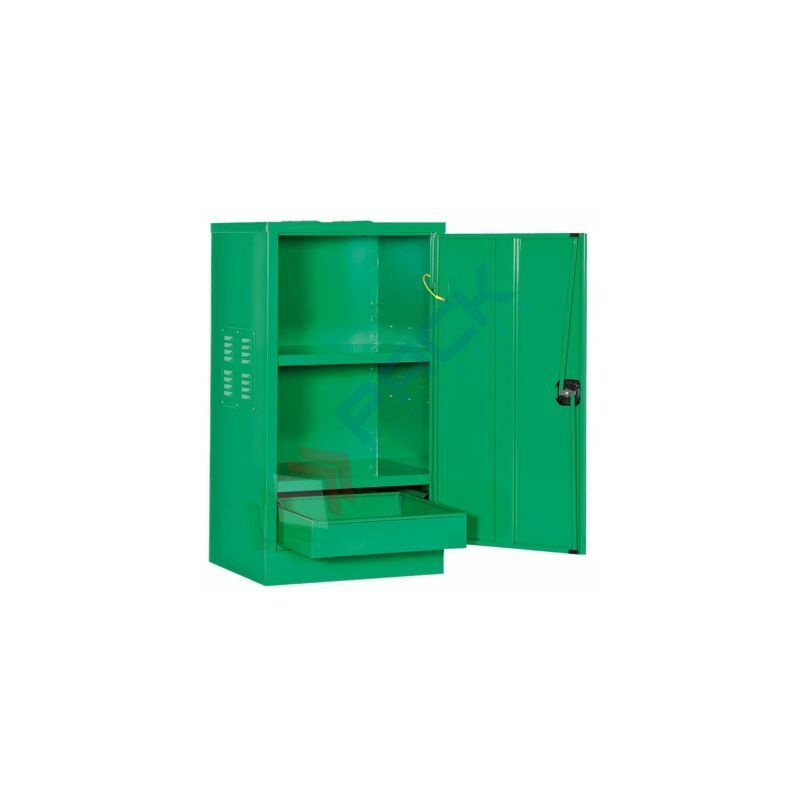 ARMADIO DI SICUREZZA PER FITOFARMACI, FITOSANITARI E PESTICIDI Armadio di sicurezza per prodotti fitofarmaci, pesticidi e fitosanitari, monoblocco, pratico ed economico. Armadietto fitofarmaci realizzato in lamiera di acciaio sp.7-8/10, idoneo per lo stoccaggio di sostanze pericolose o nocive conforme alle norme attualmente in vigore per igiene e sicurezza sul lavoro e tutela dellambiente, etichetta di segnaletica come da D.Lgs.81/08, predisposizione per la messa a terra. Armadio di sicurezza Mis. 580 L x 460 P x 1000/1060 H mm, dotato di 4 piedini regolabili fino a 6 cm, 1 anta battente rinforzata cieca e serratura con aste e maniglia, 2 piani zincati mobili forati per lo sgocciolamento, vasca di raccolta estraibile sul fondo con capacità 20 Lt, feritoie daerazione con griglie frangifiamma nei fianchi e sul cielo. Armadietto per fitosanitari e per fitofarmaci progettato per rispondere alle esigenze dei principali standard sanitari. Nessun luogo di lavoro deve essere esposto a rischi