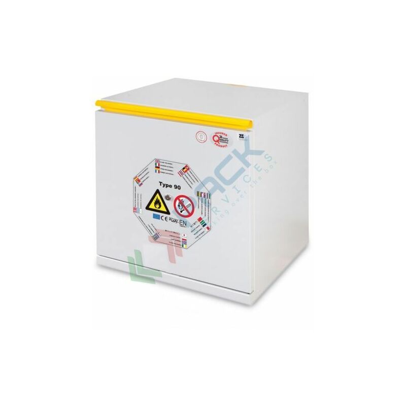 ARMADIO DI SICUREZZA PER PRODOTTI INFIAMMABILI - TYPE 90 Armadio di sicurezza per lo stoccaggio di prodotti infiammabili con classe di resistenza al fuoco certificata 90 minuti (TYPE 90). Armadio di stoccaggio Mis. esterne 595 L x 520 P x 620 H mm, Mis. interne 483 L x 349 P x 493 H mm, capacità 15 bottiglie da 1 Lt, peso 82 Kg. Realizzato in lamiera di acciaio elettrozincata con spessori di 1;