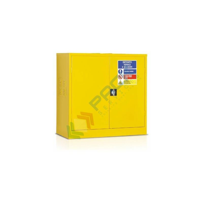 ARMADIO DI SICUREZZA PER LO STOCCAGGIO DI PRODOTTI INFIAMMABILI Armadio di sicurezza per il deposito di liquidi infiammabili, monoblocco, realizzato in lamiera di acciaio al carbonio P02 spessore 10/10, pre-trattata con fosfosgrassaggio in tunnel ad alte temperature, verniciatura in epossipoliestere cottura in galleria termica 180°, Mis. esterna 1000 L x 460 P x 1000 H mm, Mis. interna 990 L x 440 P x 910 H mm. Armadio di sicurezza idoneo per lo stoccaggio di liquidi pericolosi o nocivi, conforme alle norme attualmente in vigore per igiene e sicurezza sul lavoro e tutela dellambiente, etichetta di segnaletica come da D.Lgs.81/08, predisposizione per la messa a terra. Armadio di sicurezza dotato di 4 piedini regolabili fino a 6 cm, 2 ante battenti cieche rinforzate e serratura con aste e maniglia, 2 ripiani di contenimento regolabili in altezza e vasca di raccolta capacità 78 Lt a tenuta stagna sul fondo con guarnizioni in gomma, n.2 griglie di areazione laterali e una posizionata sul
