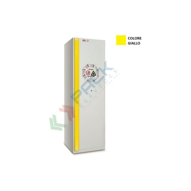 ARMADI DI SICUREZZA PER LO STOCCAGGIO DI PRODOTTI INFIAMMABILI Certificati secondo le norme EN14470-1 Type 90 e EN 16121 Armadio di sicurezza per lo stoccaggio di prodotti infiammabili realizzato in lamiera di acciaio elettrogalvanizzata dello spessore di 1 - 1,5 mm, piegata a freddo, Mis. esterna 595 L x 600 P x 2050 H mm, Mis. interna 496 L x 446 P x 1540 H mm, chiusura automatica delle ante quando la temperatura ambiente supera i 50 °C. L'armadio di sicurezza per infiammabili è certificato secondo le norme EN14470-1 e EN16121, garantisce resistenza al fuoco certificata 90 min. Armadio con 3 ripiani in acciaio verniciato (carico max 60 Kg distribuiti uniformemente) + 1 vasca con griglia (capacità 20 litri), capacità di stoccaggio 80/100 bottiglie da 1 Litro per armadio, apertura dell'anta ad incavo a destra. Colore giallo. Caratteristiche tecniche: Misura esterna: 595 L x 600 P x 2050 H mm Mis. interna: 496 L x 446 P x 1540 H mm Accessori in dotazione: 3 ripiani in acciaio