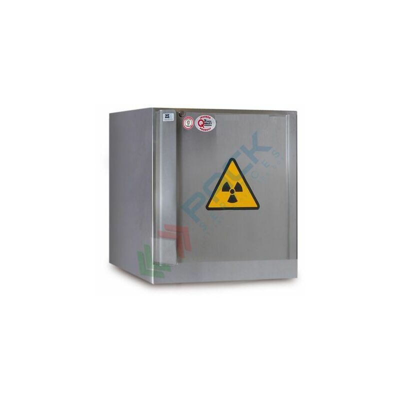 Armadio di sicurezza per lo stoccaggio di prodotti infiammabili e radioattivi con classe di resistenza al fuoco 90 minuti, realizzato in acciaio inossidabile AISI 304 elettrogalvanizzato con uno spessore da 1 a 1,5 mm, piegato a freddo, isolamento tramite pannelli di lana di roccia ad alta densità e pannelli di solfato di calcio. Armadio per prodotti radioattivi Type 90, Mis. esterna 590 L x 500 P x 620 + 80 H mm, Mis. interna 490 L x 440 P x 510 H mm, capacità di stoccaggio di 15/20 bottiglie da 1 Lt, vasca con griglia in acciaio INOX capacità 20 Lt, senza ripiani. Sistema di chiusura e blocco che consente di tenere le porte aperte e chiuderle automaticamente in caso di temperatura ambiente superiore a 50 °C. Certificato con resistenza al fuoco 90 minuti, secondo la norma EN14470-1.