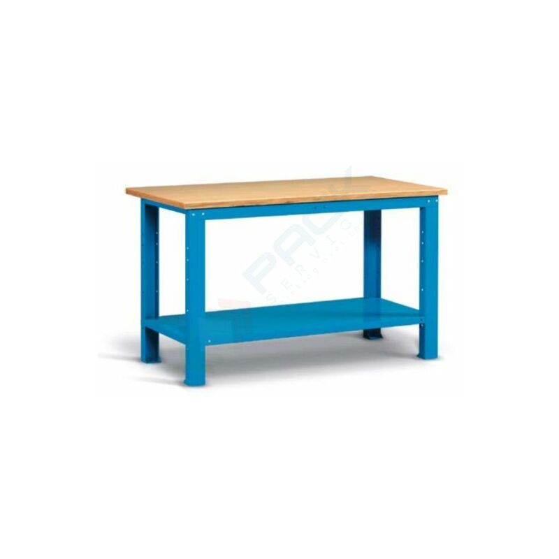 Banco da lavoro in acciaio, realizzato con piano in multiplex 30 mm, Mis. 1024 L x 750 P x 880 H mm, con piano inferiore regolabile in altezza. Colore blu RAL 5012. Portata 1000 Kg. Fornito montato.