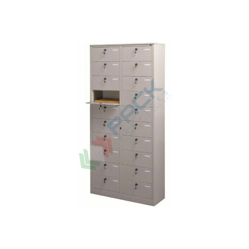 CARTELLIERA CON APERTURA SINGOLA Cartelliera metallica a 20 caselle, Mis. 900 L x 350 P x 2000 H mm, struttura portante e ante realizzate in lamiera dacciaio di prima scelta presso piegata e adeguatamente rinforzata spessore 8/10. I vani sono chiusi da serratura singola per ogni anta, queste si aprono dallalto verso il basso con fermo orizzontale a 90° creante un piano di appoggio / consultazione. Zoccolo di base rialzato per consentire facile accesso ai vani inferiori. Le antine sono corredate di porta cartellino indicatore e serrature con chiave in doppio esemplare. Materiale fornito smontato ed imballato in colli di cartone. Chiusura serratura a cilindro con doppia chiave. Cartelliera con verniciatura a polveri epossipoliestere a forno applicate elettrostaticamente e cotte a 180°, previo sgrassaggio in 5 distinte fasi: 1) Pre-trattamento 2) Sgrassaggio e fosfatazione 3) Lavaggio con acqua e rinnovo continuo 4) Passivazione 5) Risciacquo con acqua demineralizzata. Tutti gli angoli
