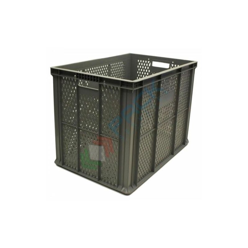 Contenitore in plastica sovrapponibile Norma Europa, capacità 85 Lt, con misura esterna: 600 L x 400 P x 420 H mm e misura interna: 569 L x 366 P x 405 H mm. La cassetta presenta base, pareti forate e maniglie passanti. Contenitore realizzato in PP (Polipropilene). Colore grigio chiaro. Scatola in plastica idonea al contatto con alimenti.