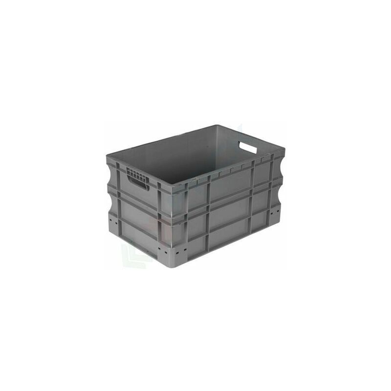 Contenitore in plastica sovrapponibile Norma Europa, capacità 65 Lt, con misura esterna: 600 L x 400 P x 330 H mm e misura interna: 569 L x 366 P x 310 H mm. La cassetta presenta base, pareti chiuse e maniglie passanti. Contenitore realizzato in PP (Polipropilene). Colore grigio chiaro. Scatola in plastica idonea al contatto con alimenti.