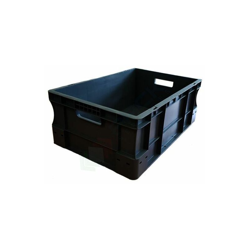 Contenitore in plastica sovrapponibile Norma Europa, capacità 40 Lt, con misura esterna: 600 L x 400 P x 230 H mm e misura interna: 569 L x 366 P x 220 H mm. La cassetta presenta base, pareti chiuse e maniglie passanti. Contenitore realizzato in PP (Polipropilene). Colore grigio scuro. Scatola in plastica NON idonea al contatto con alimenti.