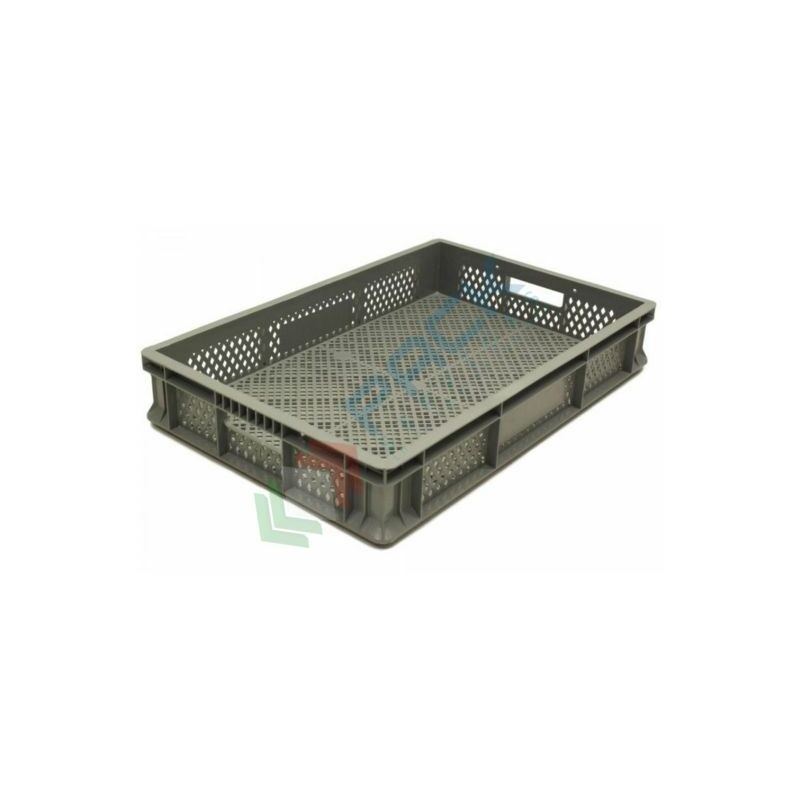 Contenitore in plastica sovrapponibile Norma Europa, capacità 17 Lt, con misura esterna: 600 L x 400 P x 90 H mm e misura interna: 569 L x 366 P x 80 H mm. La cassetta presenta base, pareti forate e maniglie passanti. Contenitore realizzato in PP (Polipropilene). Colore grigio chiaro. Scatola in plastica idonea al contatto con alimenti. Intervallo di temperatura di utilizzo -10 °C / + 60 °C. Portata singola cassetta 20 Kg, impilaggio 160 Kg.