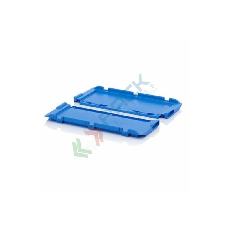 Coperchio incernierato per casse inseribili e sovrapponibili con base 800 x 600 mm. Composto da 2 pz coperchio a cerniera + 8 cerniere.
