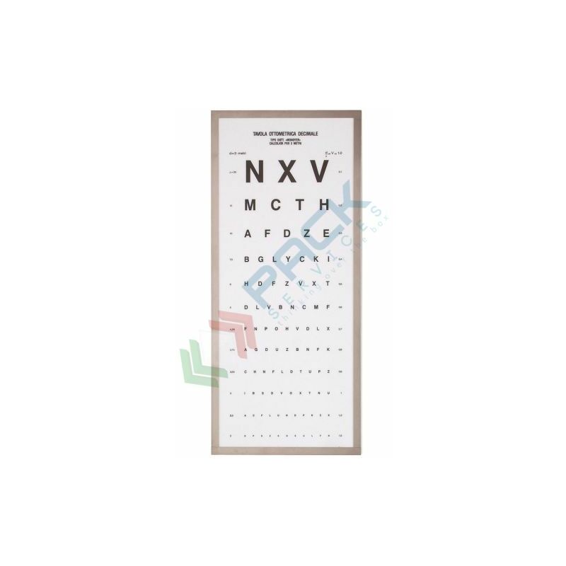 Ottotipo semplice con schermo in materiale acrilico, mis. 31 x 68 cm. Utilizzare ad una distanza di 3 m. Costruito secondo le norme C.E.I. 62/5 valide per le apparecchiature elettromedicali.