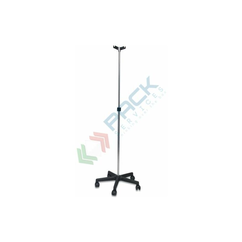 Piantana ipodermoclisi 2 ganci, base a 5 razze in plastica con ruote. Altezza variabile 163/230 cm.