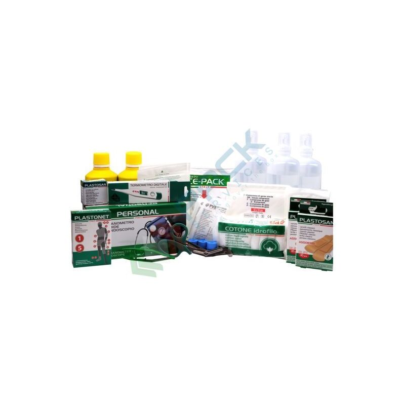 Pacco medicazione per cassette pronto soccorso e armadietti con contenuto a norma dell' allegato 1 D.M. 388 del 15 luglio 2003 (art. 1) G.U. 27 del 03 febbraio 2004 D.L. 81 del 09 aprile 2008 art. 45, per aziende del gruppo A e B. Kit reintegro Mis. 390 L x 200 P x 210 H mm, peso 4,40 Kg. I prodotti definiti dispositivi medici, contenuti nel kit pronto soccorso sono conformi alla direttiva CE 93/42 al DL 24.2.97 e al 2007/47/CEE.