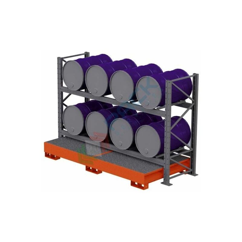 SCAFFALATURA IN ACCIAIO CON VASCA DI CONTENIMENTO PER LO STOCCAGGIO DI 8 FUSTI OLIO 200 LT Scaffale metallico componibile ad incastro con vasca di raccolta, ideale per lo stoccaggio di 8 fusti da 200 Litri, in orizzontale su 2 livelli, Mis. vasca: 2660 L x 1060 L x 320 H mm + scaffalatura: 2900 L x 1060 P x 2000 H mm, capacità di stoccaggio 621 Litri. La vasca di contenimento abbinata alla scaffalatura, è la soluzione ideale e sicura per lorganizzazione di aree di deposito, al fine di prevenire eventuali sversamenti di sostanze pericolose ed inquinanti. Le scaffalature con vasca di raccolta sono indicate per lo stoccaggio di cisterne in sicurezza in quanto sono dotate di una vasca di contenimento inferiore che impedisce ad eventuali sversamenti di sostanze pericolose ed inquinanti di propagarsi allinterno di ambienti di lavoro o di falde acquifere. Colore arancio RAL 2004. Caratteristiche tecniche: Stoccaggio: 8 fusti 200 Lt in orizzontale su 2 livelli Dimensioni vasca: 2660 L x 1060