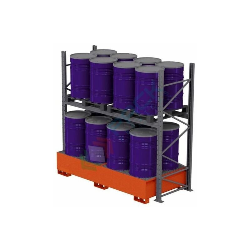 SCAFFALATURA IN ACCIAIO CON VASCA DI CONTENIMENTO PER LO STOCCAGGIO DI 16 FUSTI OLIO 200 LT Scaffale metallico componibile ad incastro con vasca di raccolta, ideale per lo stoccaggio di 16 fusti da 200 Litri. Mis. Vasca: 2550 L x 1250 P x 500 H mm + Scaffalatura: 2900 L x 800 P x 3000 H mm, capacità di stoccaggio 1275 Litri. La vasca di contenimento abbinata alla scaffalatura, è la soluzione ideale e sicura per lorganizzazione di aree di deposito, al fine di prevenire eventuali sversamenti di sostanze pericolose ed inquinanti. Le scaffalature con vasca di raccolta sono indicate per lo stoccaggio di cisterne in sicurezza in quanto sono dotate di una vasca di contenimento inferiore che impedisce ad eventuali sversamenti di sostanze pericolose ed inquinanti di propagarsi allinterno di ambienti di lavoro o di falde acquifere. Colore arancio RAL 2004. Caratteristiche tecniche: Stoccaggio: 16 fusti 200 Lt Dimensioni vasca: 2550 L x 1250 P x 500 H mm Dimensioni scaffalatura: 2900 L x 800 P x