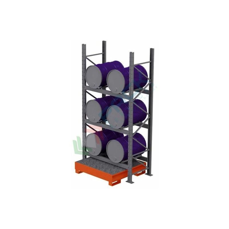 SCAFFALATURA IN ACCIAIO CON VASCA DI CONTENIMENTO PER LO STOCCAGGIO DI 6 FUSTI OLIO 200 LT Scaffale metallico componibile ad incastro con vasca di raccolta, ideale per lo stoccaggio di 6 fusti da 200 Litri, in orizzontale su 3 livelli, Mis. vasca: 1510 L x 1340 P x 350 H mm + scaffalatura: 1980 L x 1340 P x 3000 H mm, capacità di stoccaggio 505 Litri. La vasca di contenimento abbinata alla scaffalatura, è la soluzione ideale e sicura per lorganizzazione di aree di deposito, al fine di prevenire eventuali sversamenti di sostanze pericolose ed inquinanti. Le scaffalature con vasca di raccolta sono indicate per lo stoccaggio di cisterne in sicurezza in quanto sono dotate di una vasca di contenimento inferiore che impedisce ad eventuali sversamenti di sostanze pericolose ed inquinanti di propagarsi allinterno di ambienti di lavoro o di falde acquifere. Colore arancio RAL 2004. Caratteristiche tecniche: Stoccaggio: 6 fusti 200 Lt in orizzontale su 3 livelli Dimensioni vasca: 1510 L x 1340