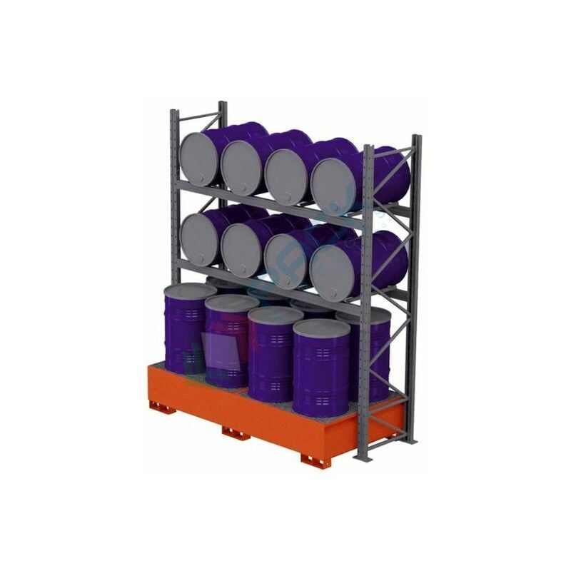 SCAFFALATURE IN ACCIAIO CON VASCA DI CONTENIMENTO PER LO STOCCAGGIO DI 16 FUSTI OLIO 200 LT Scaffale metallico componibile ad incastro con vasca di raccolta, ideale per lo stoccaggio di 16 fusti da 200 Litri (8 verticali + 8 orizzontali su 2 livelli), Mis. vasca: 2550 L x 1250 P x 500 H mm + scaffalatura: 2900 L x 1300 P x 3000 H mm, capacità di stoccaggio 1275 Litri. La vasca di contenimento abbinata alla scaffalatura, è la soluzione ideale e sicura per lorganizzazione di aree di deposito, al fine di prevenire eventuali sversamenti di sostanze pericolose ed inquinanti. Le scaffalature con vasca di raccolta sono indicate per lo stoccaggio di cisterne in sicurezza in quanto sono dotate di una vasca di contenimento inferiore che impedisce ad eventuali sversamenti di sostanze pericolose ed inquinanti di propagarsi allinterno di ambienti di lavoro o di falde acquifere. Colore arancio RAL 2004. Caratteristiche tecniche: Stoccaggio: 16 fusti 200 Lt (8 verticali + 8 orizzontali su 2 livelli)