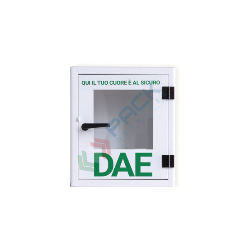 TECA PER DEFIBRILLATORE DA ESTERNO Teca per defibrillatore da esterno realizzata in lamiera di acciaio al carbonio elettro zincato, verniciatura a polvere di poliestere alta resistenza agli agenti atmosferici spigoli arrotondati 1 anta a battente con chiusura a maniglia e accessorio per sigillo plastico o metallico con foro ridotto al fine di evitare linserimento di lucchetti e impedire il prelievo del defibrillatore in situazione di emergenza. La teca per DAE da esterno impermeabile, ha Mis. 420 L x 210 P x 480 H mm, è dotata di vetro in plexiglass, guarnizione in gomma su battuta, due robuste cerniere in zama verniciata e adesivo di identificazione AED (incluso). Teca da esterno per defibrillatore è realizzata in acciaio con protezione da acqua e polvere e dispone della certificazione di protezione IP44. L'armadietto per teca presenta fori per applicazione a parete o su totem. Colore bianco. Caratteristiche tecniche: Teca da esterno Mis. 420 L x 210 P x 480 H mm In lamiera di