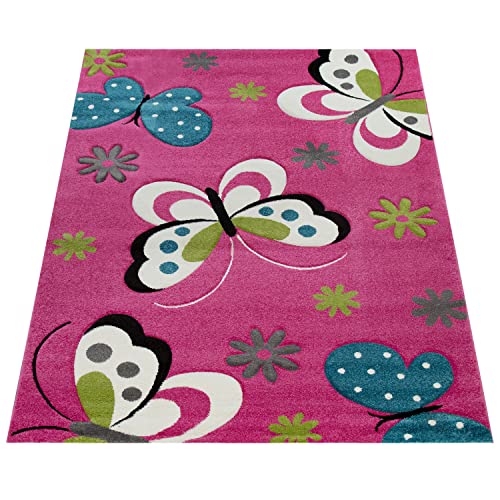 Paco Home Tappeto Bambina Per Stanza Bambini Con Farfalla E Fiori Rosa Fuchsia Blu Crema, Dimensione:80x150 cm