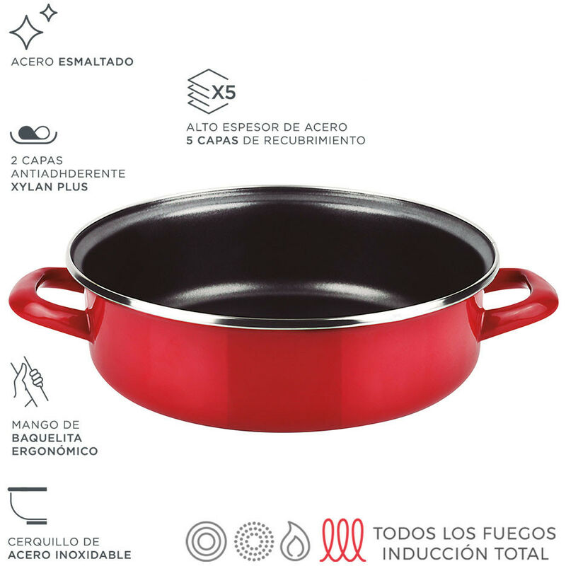 Padella optimax ø26cm acciaio rosso aisi 430. acciaio smaltato. acciaio ad alto spessore con 5 strati di rivestimento. rivestimento antiaderente a doppio strato xylan plus. bordo in acciaio inox. manici ergonomici in bachelite termoisolante. senza cadmio e pfoa. 0,0% di metalli pesanti. adatto a tutti i tipi di fuoco. adatto al forno. fagor ø26x8cm (diametro/altezza)