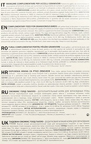 Pastoncino giallo, da somministrare in associazione all'alimento di base, per aumentare la disponibilità di nutrienti in particolari fasi di vita degli uccelli granivori (muta e riproduzione) o in periodi in cui l'animale è sottoposto a stress