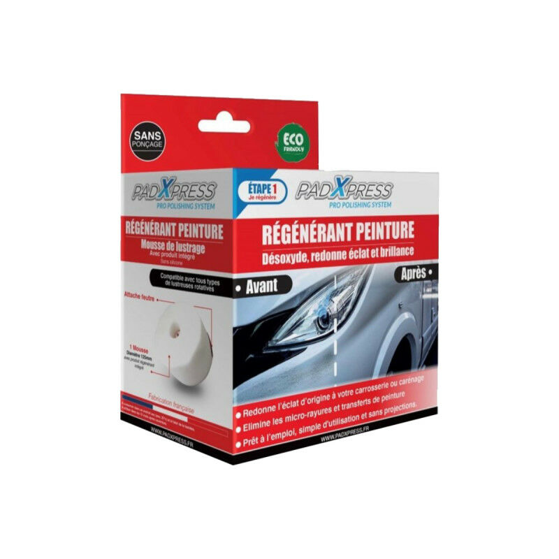 Presentazione: PadXpress Rigeneratore per camper - 125 mm sarà il vostro alleato per una carrozzeria impeccabile. Questa formula disossidante e non abrasiva ridà vita alla vostra carrozzeria eliminando i micrograffi. Progettato per uso domestico e professionale, il rigeneratore è facile da applicare grazie al suo dispositivo: una schiuma con serbatoio integrato, che si fissa al vassoio della vostra lucidatrice. Questo prodotto deve essere usato con cura, leggendo sempre attentamente l'etichetta e le istruzioni prima di utilizzarlo. Non lasciare che il prodotto entri in contatto con la pelle, gli indumenti, gli occhi o la bocca, tenere fuori dalla portata dei bambini. Consigli: La superficie deve essere pulita e asciutta Assicurarsi che il vassoio di lucidatura abbia un diametro di Ø125 mm. Come si usa: Posizionare l'applicatore di schiuma sulla lucidatrice e selezionare una velocità massima di 1500 giri/min. Posizionare la schiuma sulla parte della carrozzeria o della carenatura da