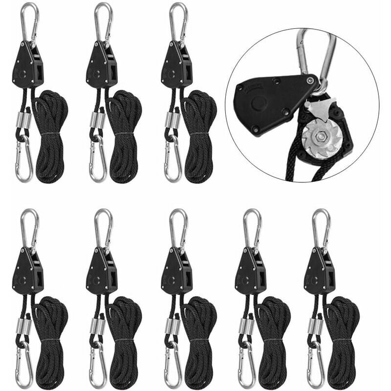 per uso polivalente. Eccellente per appendere riflettori e lampadari. Funziona alla grande anche per appendere filtri a carbone, apparecchiature di ventilazione e molto altro. 4 coppie di 1/8" appendini a cricchetto per corde leggere per carichi pesanti. Clip per moschettone da 16 pezzi - Easy & auto veloce. Blocco, design a prova di allentamento per garantire la sicurezza. 150lbs/pr.Garantisce la massima flessibilità d'uso e