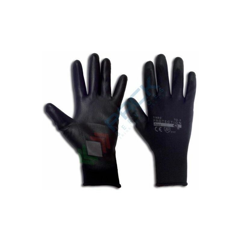 Guanti antinfortunistici da lavoro in filato di nylon con palmo ricoperto in poliuretano. I polsini in nylon e lattice permettono una perfetta aderenza al polso. Guanti da lavoro certificati CE, EN 388 (Guanti di protezione contro i rischi meccanici). Prodotto venduto a paia. Colore nero, taglia 8.
