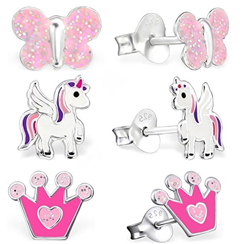 Set di 3 paia di orecchini da bambina in argento 925 con corona smaltata unicorno farfalla (rosa rosa), Argento sterling, Non pertinente.