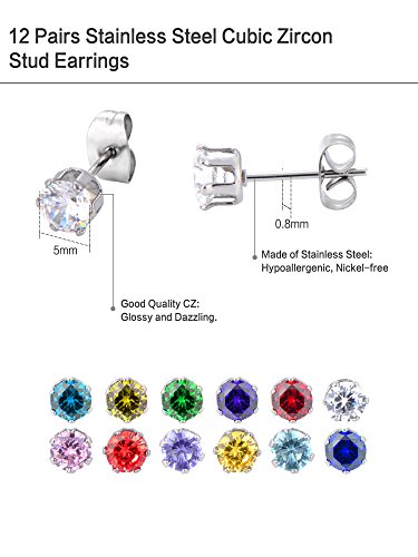 12 Paia Orecchini a Bottone in Acciaio Inossidabile Orecchino Borchie Rotondo Zirconi per Donne Ragazze, 12 Colori