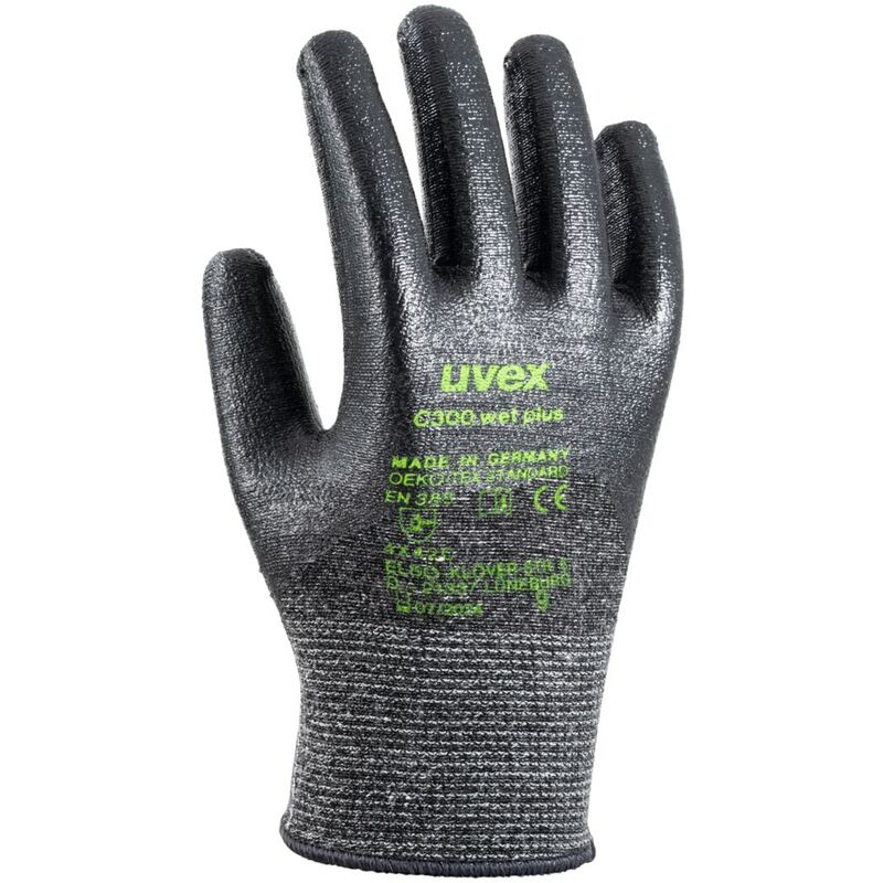 Uvex 300 Serie. Guanto leggero e innovativo con tecnologia Bamboo-TwinFlex®, che assicura una buona protezione antitaglio, un'elevata resistenza all'abrasione e una piacevole sensazione di comfort. La procedura uvex climazone garantisce un'elevata flessibilità e una piacevole temperatura delle mani, senza trascurare la sensibilità tattile. Standard Öko-Tex® 100 e privo di silicone. C300 wet plus. Con rivestimento su 3/4 in schiuma di nitrile per lavori con pericoli di taglio medi in ambienti oleosi, grassi o umidi. Norma: EN 388;