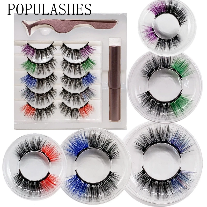 5 Pairs Colorful Magnetic Eye Lashes with 5 Magnets Tweezers and Waterproof Liquid Eyeliner Set Laser Bag Fake Mink Lash