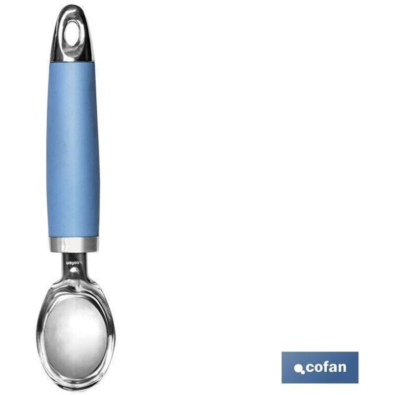 Cucchiaio da gelato modello Sena. È realizzato in acciaio inossidabile 430 di buona qualità con cromo TPR e ha una maniglia ergonomica in ABS blu. L'utensile misura 18 cm. Adatto all'uso alimentare e lavabile in lavastoviglie. Caratteristiche tec
